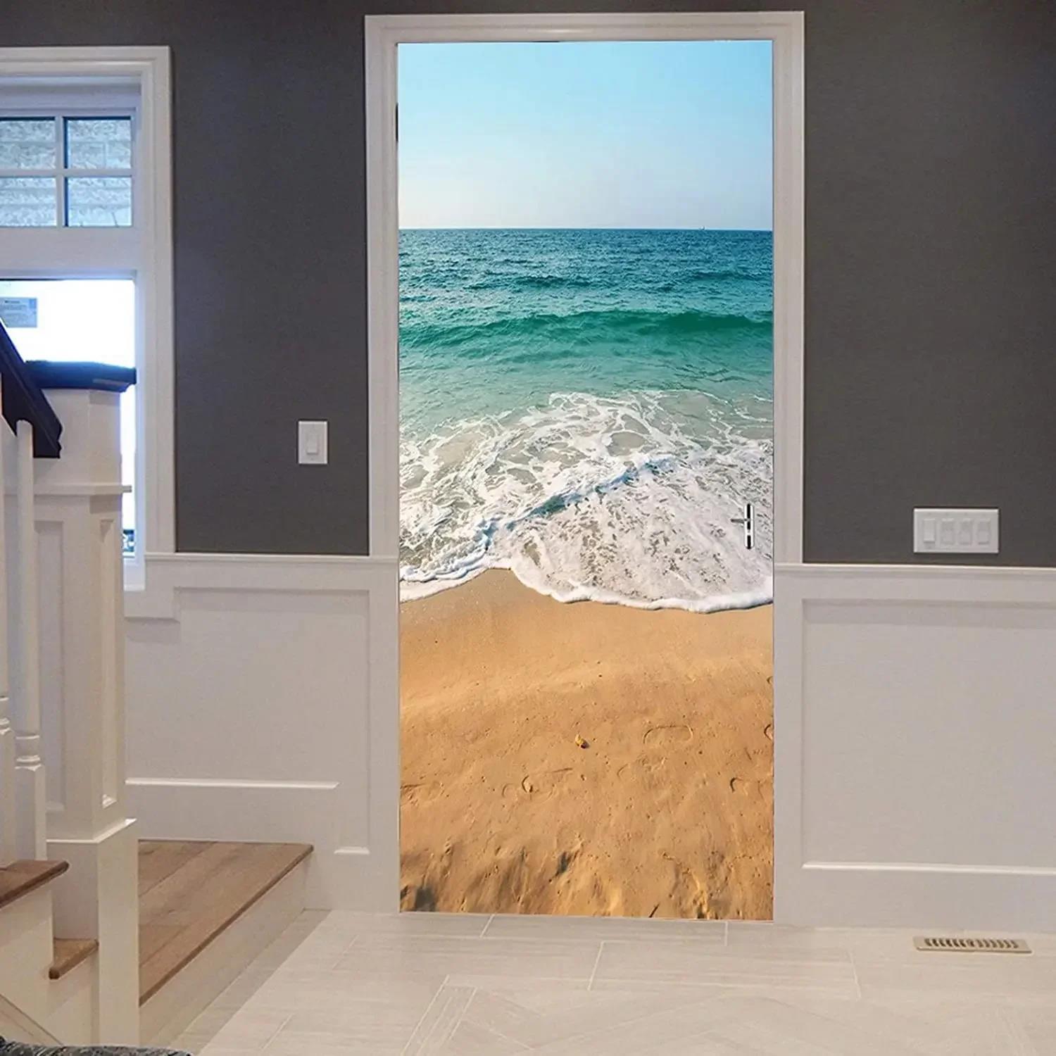 호환 3D 보라색 하늘 해변 도어 스티커 드림 오션 풍경 스티커 하와이 오션 벽화 벽지 홈 거실 장식