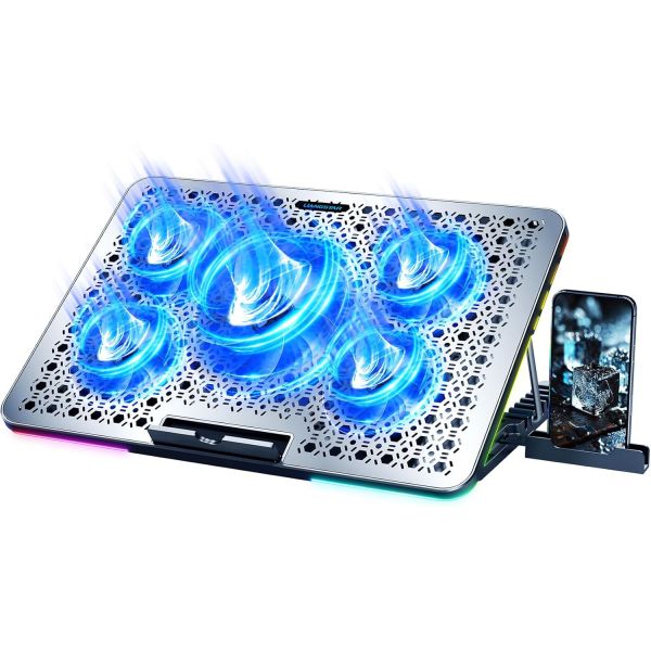 LIGANSTAR 노트북 쿨링 패드 쿨러 게이밍 5개의 조용한 팬12~17.3인치 팬 안정 스탠드용 대형 금속판 포함 4가지 모드 RGB 라이트 7가지 높이 및 속도 조절 USB